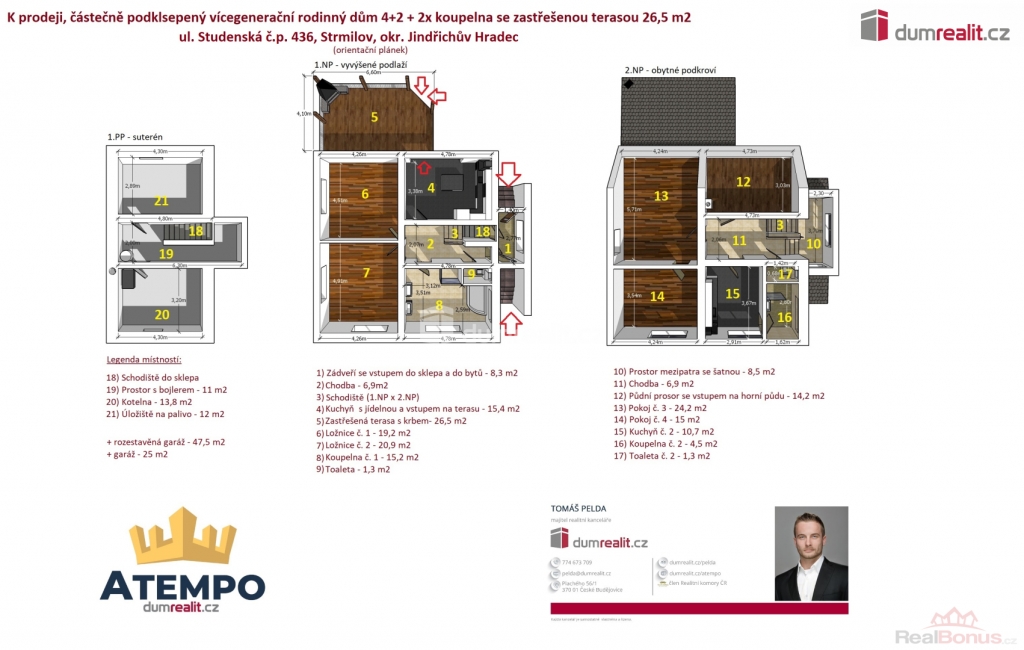 Cena je včetně provize RK a právního servisu. Více informací Vám poskytne makléř Tomáš Pelda., Dumrealit.cz Vám zprostředkuje prodej světlého, zděného, částečně podsklepeného, zrekonstruovaného vícegeneračního nebo prostorného rodinného domu 4+2 se dvěma koupelnami, zastřešenou terasou a 2 garážemi, z nichž 1 pro 2 automobily je před dokončením ve městě Strmilov, ul. Studenská 436, okr. Jindřichův Hradec. Orientační plánek s podrobným rozkreslením jednotlivých podlaží naleznete mezi fotografiemi. Zrekonstruovaný RD má nová plastová okna s trojskly, novou elektřinu, nové rozvody vody, topení a kanalizace včetně přípojek. Rozvody jsou vytaženy až do půdního prostoru. Nový krov, střešní krytina, omítky i podlahy domu. Vytápění je kotlem na tuhá paliva se zásobníkem 300l s elektrickým dohřevem vody. Komíny jsou 2: 1) vyfrézovaný s nerezovou vložkou pro kotel na tuhá paliva; 2) vyvložkovaný pro plynový kotel - plyn zaveden až do domu. Spotřeba paliva je cca 15 m3 tvrdého dřeva. Více informací Vám poskytne realitní makléř Tomáš Pelda z realitní kanceláře A TEMPO fungující pod ochrannou známkou dumrealit.cz. Zajistíme Vám financování a veškerý právní servis. Ev. číslo: 652019. Energetický štítek: G