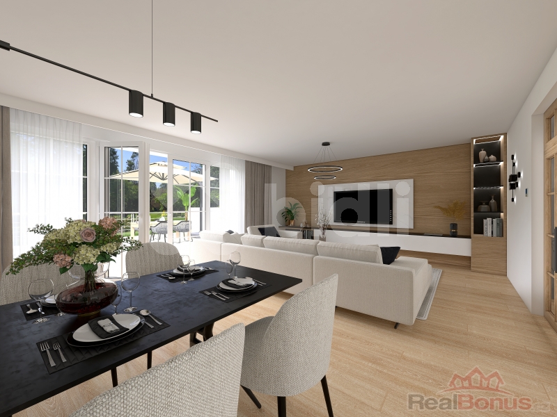 V 1. patře je užitná plocha cca 147 m2 z toho cca 58 m2 má zahradní terasa, kde jsou umístěna krbová kamna vhodná na letní grilování. Dále je vstupní chodba, WC a technická místnost, kuchyň, obývací pokoj s jídelnou a schodiště.