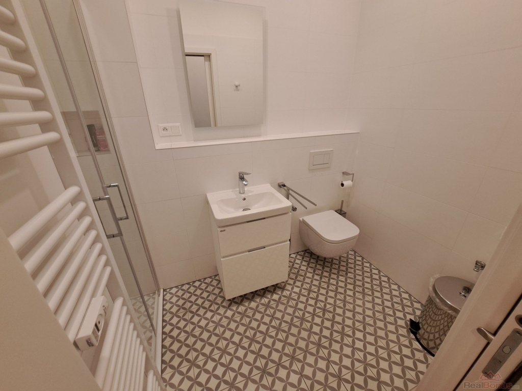 Koupelna s WC je vybavena sprchovým koutem, umyvadlem, zrcadlovou skříňkou, topným žebříkem, WC.