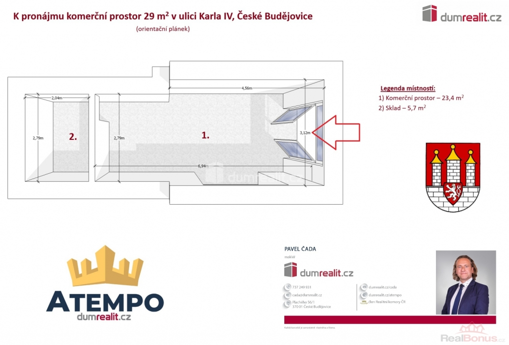 + poplatky 6.789,- Kč. Více informací Vám poskytne realitní makléř Pavel Čada., Dumrealit.cz Vám zprostředkuje pronájem komerčních prostor o celkové ploše 26 m v exkluzivní lokalitě na náměstí Přemysla Otakara II, České Budějovice. Prostory lze využít jako obchodní prostory. Podrobné rozkreslení prostoru naleznete na orientačním plánku mezi fotografiemi. Nájemné činí 20.000,- Kč + poplatky 6.789,- Kč měsíčně. Doporučuji osobní prohlídku, prostor je připraven k užívání. Více informací Vám poskytne realitní makléř Pavel Čada z RK A TEMPO fungující pod ochranou známkou dumrealit. Ev. číslo: 652653. Energetický štítek: G