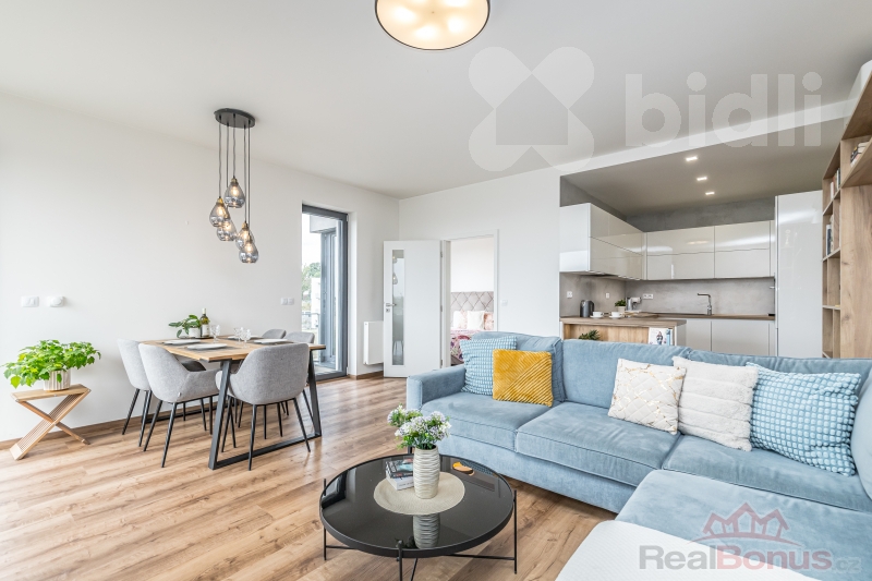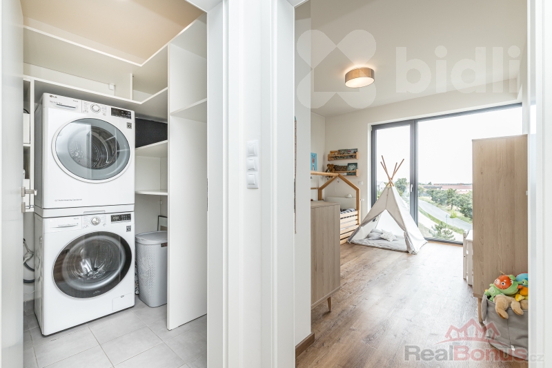 Dispozice 4+kk nabízí obývací pokoj s moderní kuchyní značky Hanák (lakovaná, ve vysokém lesku, vybavená vestavnými spotřebiči), hlavní ložnici, dva další pokoje vhodné jako dětský pokoj, pracovna nebo pokoj pro hosty, dvě koupelny (vana i sprchový kout), dvě toalety a praktickou technickou místnost s pračkou, sušičkou a úložným prostorem. V bytě je dostatek vestavěných skříní, bezpečnostní vstupní dveře, kvalitní vinylové podlahy a dlažba.