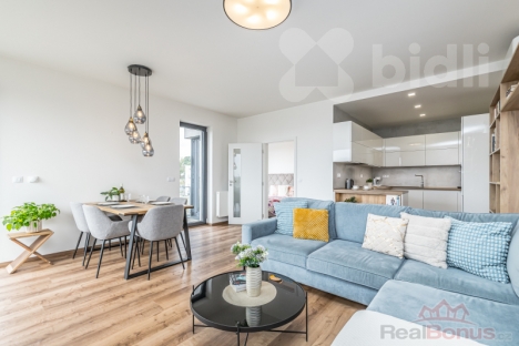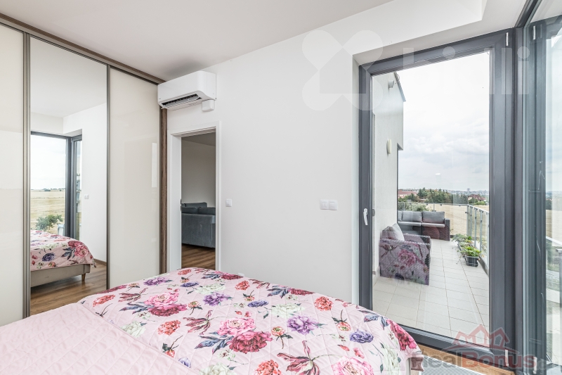 Byt se nachází v posledním patře nízkopodlažní novostavby a je zařízený na míru. Vyniká vysokou kvalitou provedení, promyšlenou dispozicí a důrazem na detail. Oceníte velkoformátová okna v každé místnosti, která zajišťují dostatek denního světla, a zároveň elektricky ovládané předokenní žaluzie, které poskytnou naprosté soukromí i tepelný komfort. Celý byt je plně klimatizovaný. Mimochodem na terasu je vstup ze všech pokojů.