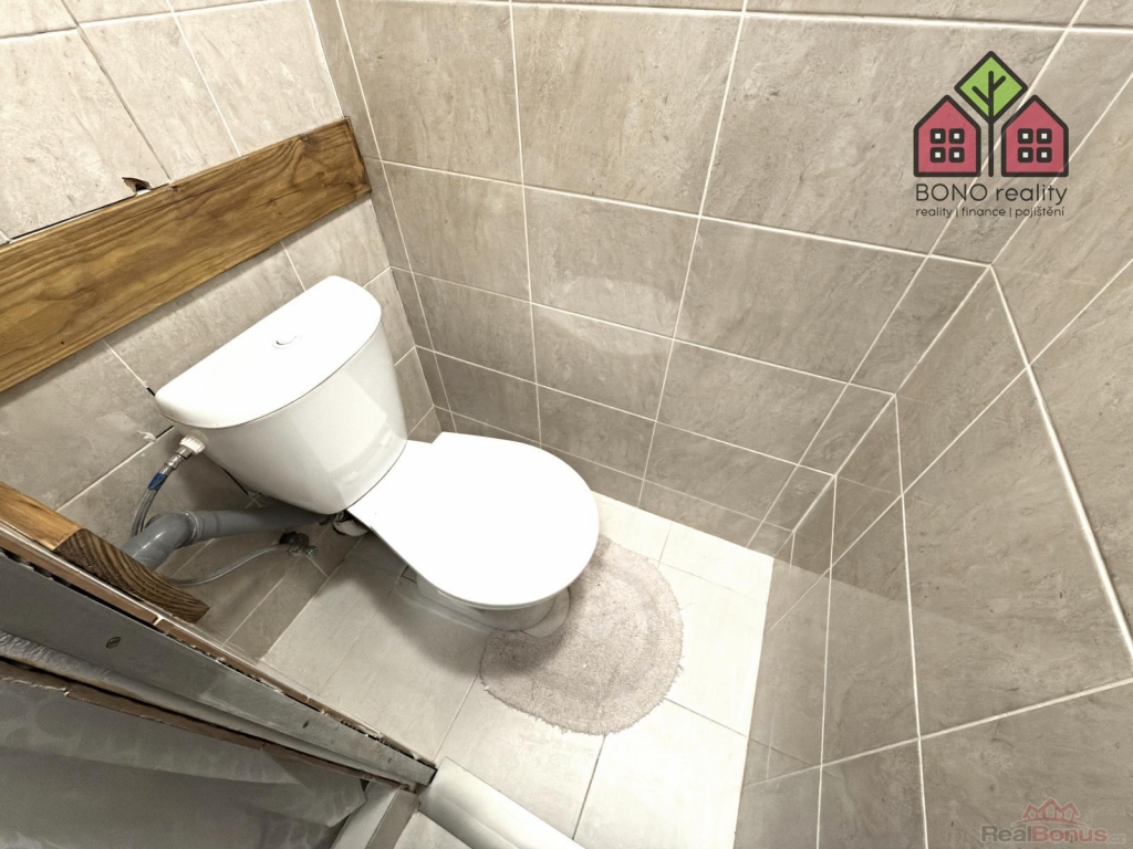 Koupelnové jádro je dosud umakartové, prošlo však částečnou rekonstrukcí. Z jedné strany bylo povrchově upraveno a obloženo příjemným keramickým obkladem. Místo malé sprchové vaničky byl vybudován velmi prostorný sprchový kout a umístěno je i umyvadlo. Toaleta je společná, částečně oddělená příčkou. Bytová jednotka má plastová okna a na podlaze je položena dlažba nebo kvalitní linoleum. K dispozici je zděný sklep.