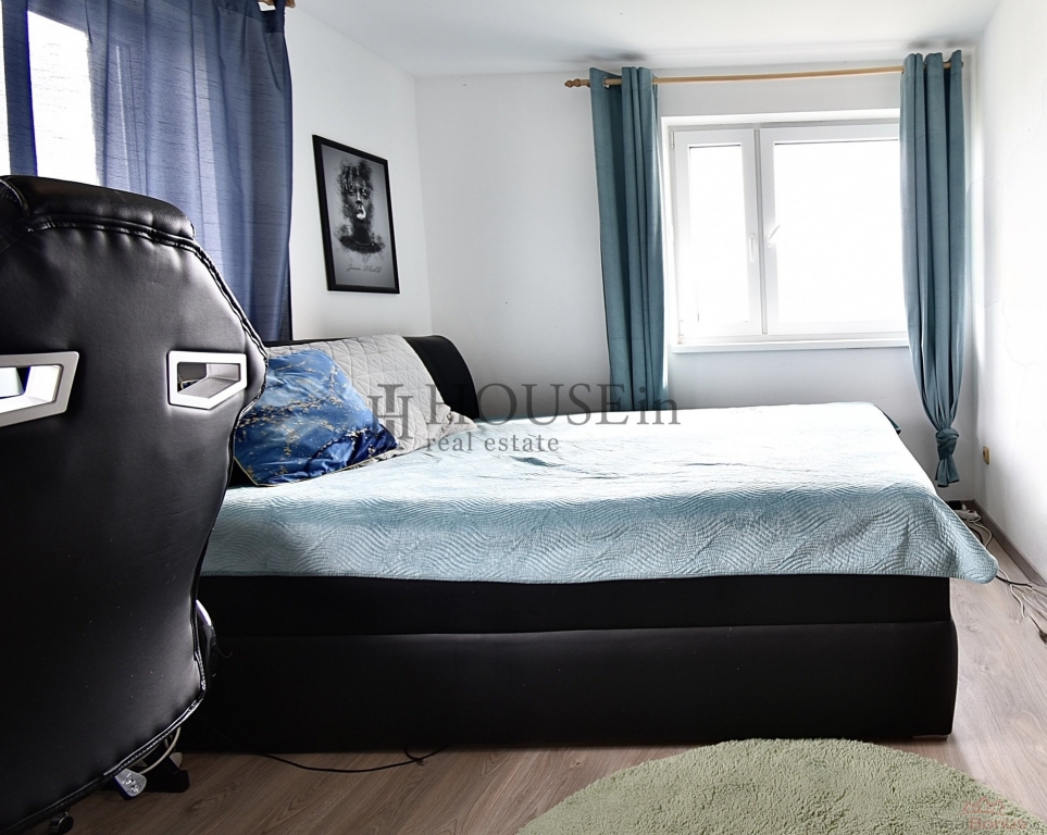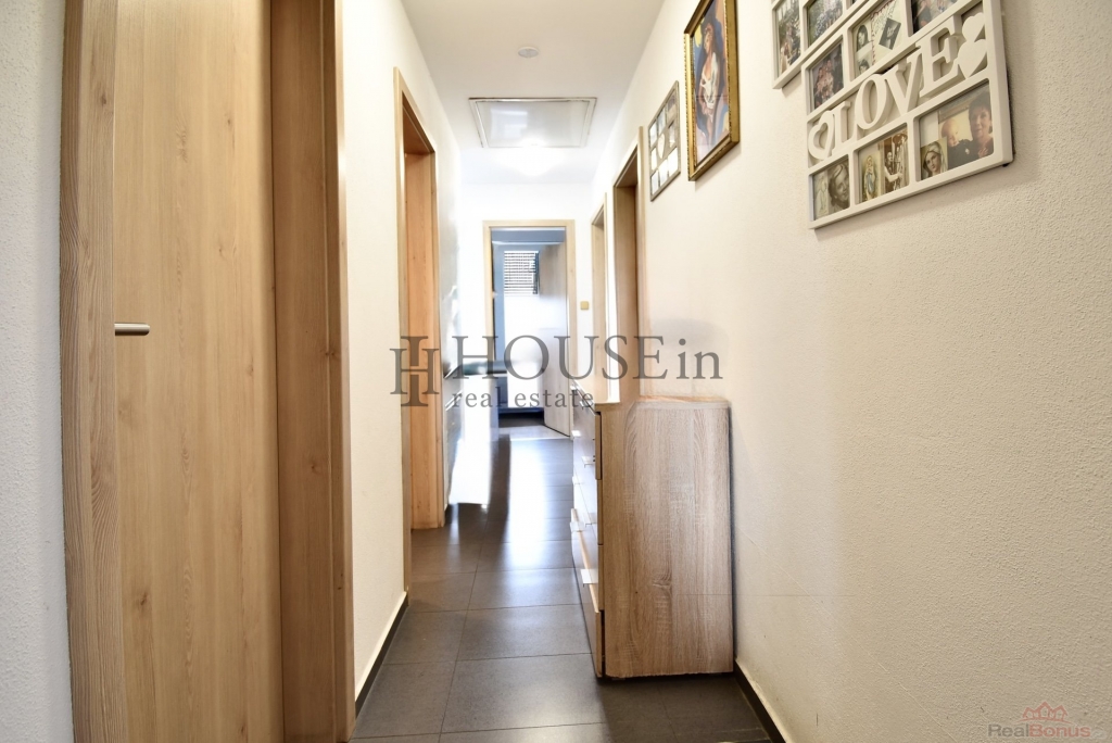 Při vchodu do domu se nachází menší chodbička s botníkem; následně se do bytu dostáváme po schodech. Koupelna disponuje vanou, dvěma umyvadly a ohřívačem na ručníky. Toaleta je zvlášť. Na zemi jsou částečně dlaždice, částečně plovoucí podlaha. Součástí kuchyně je kuchyňská linka, myčka na nádobí, chladnička s mrazákem, indukční deska, trouba a mikrovlnná trouba. Pračka v bytě nebude, třeba míti vlastní. V bytě můžete vidět i komoru/šatnu na uskladnění nejrůznějších věcí. V místnosti, kde je kuchyně se nachází k tomu ještě menší obýváček, hlavní prostorný obývací pokoj je hned vedle, poté vedle sebe následují tři od sebe oddělené pokoje/místnosti, kdy jeden představuje ložnici, druhý dětský pokoj a třetí například pracovnu nebo také další dětský pokoj.