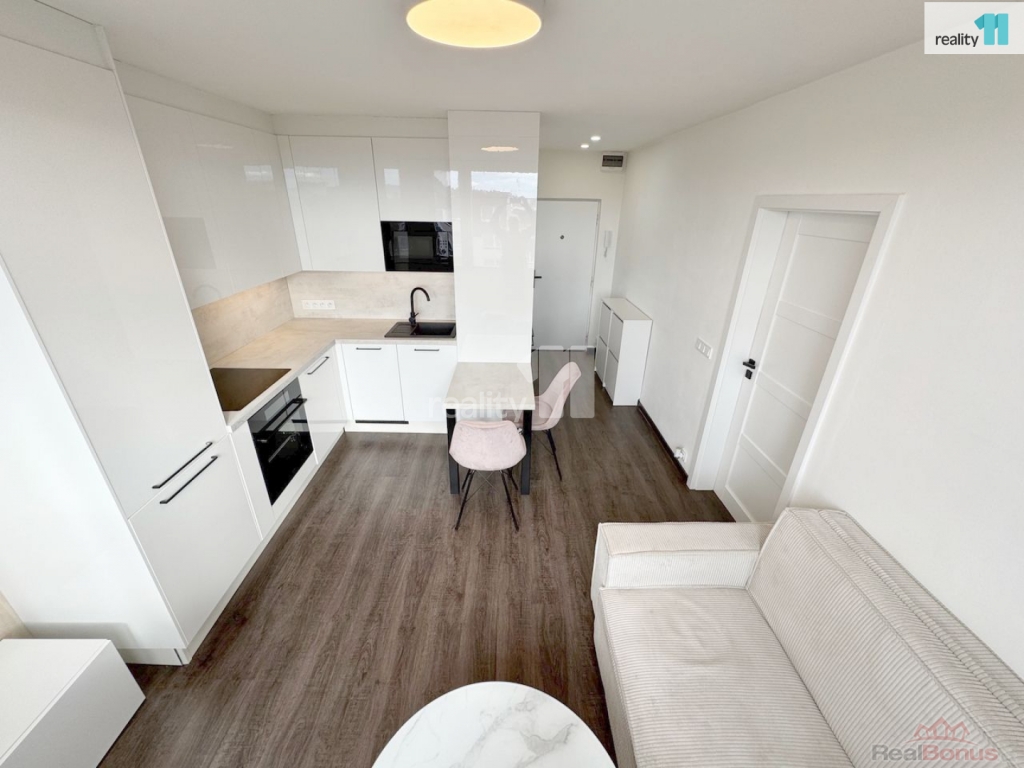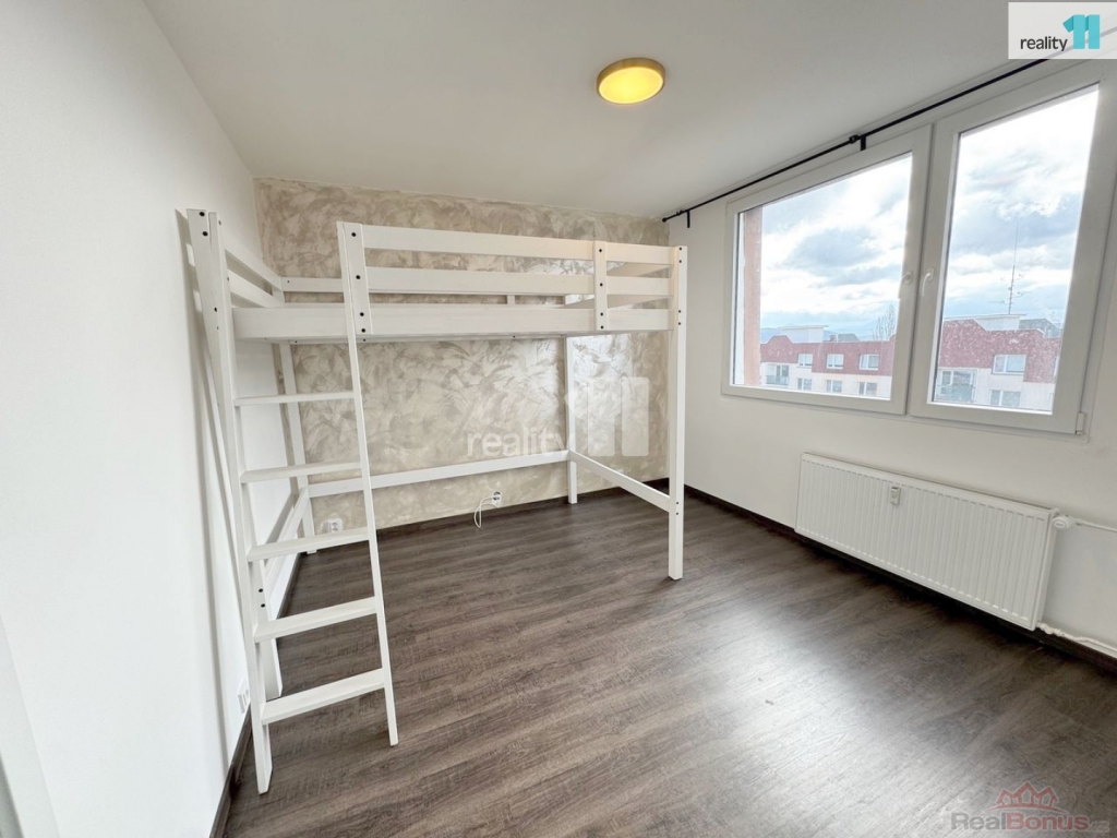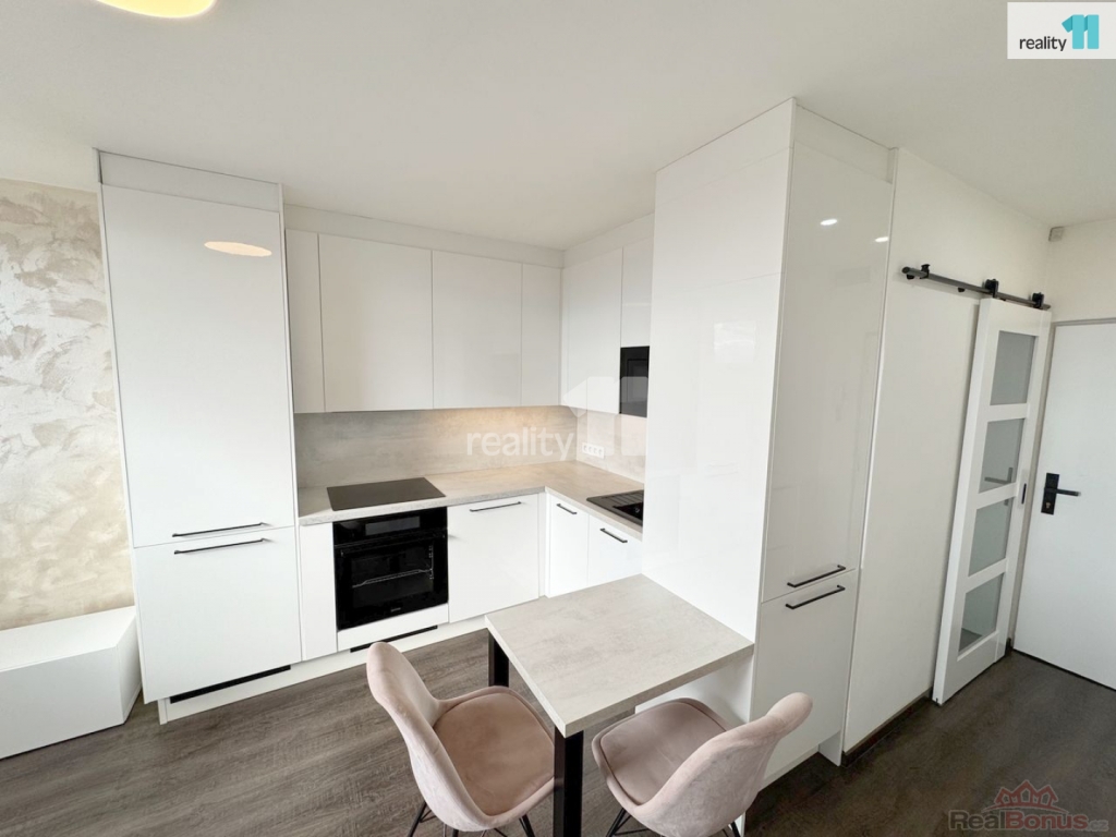 Byt prošel kompletní rekonstrukcí, kdy došlo k velmi praktickému využití prostoru. Při vstupu do bytu najdeme po pravé straně vstup do koupelny se sprchovým koutem a toaletou, dále kuchyni do L (lednice, myčka, pračka, sklokeramická deska, trouba), s menší rozkládací pohovkou. Z kuchyně se pak vchází do ložnice, která je prázdná (postel zde již není). V ložnici je dostatek prostoru i na případný pracovní kout. Část ložnice byla přepažena, čímž vznikla praktická šatna, do které pohodlně schováte všechno oblečení. Byt je v posledním patře, sousedi velmi klidní.