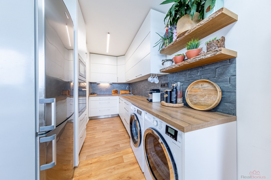 Kuchyňská linka na míru včetně vestavěných spotřebičů (myčka, horkovzdušná trouba včetně indukční desky, mikrovlnná trouba, lednice, digestoř), granitový kuchyňský dřez.