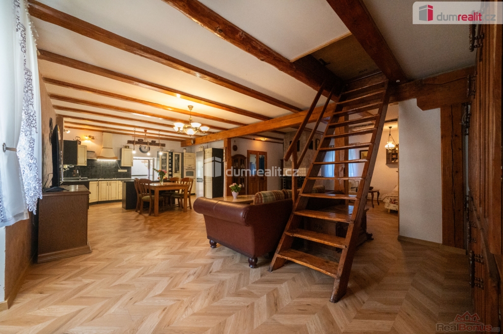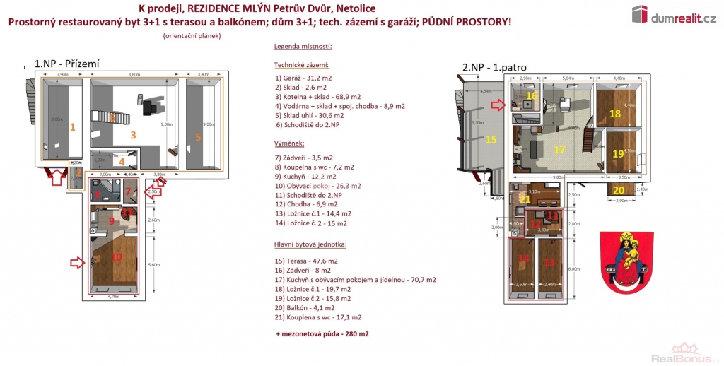 Cena je včetně provize RK a právního servisu. Více informací Vám poskytne makléř Tomáš Pelda., Dumrealit.cz Vám zprostředkuje bývalý mlýn Petrův Dvůr: restaurovaný byt 3+1 s terasou a balkónem; výměnek (rodinný dům) 3+1; technické zázemí s garáží; mezonetová půda a udržovaná oplocená zahrada na polosamotě ve vesnici Petrův Dvůr, která je součástí města Netolice. Podrobné rozkreslení dispozice rezidence naleznete na orientačním plánku mezi fotografiemi. Hlavní bytová jednotka 3+1 s terasou a balkónem. Nad hlavní byt. jednotkou je mezonetový půdní prostor, který můžeme rozšířit o byt, popř. vystavět další oddělené jednotky se samostatným pavlačovým vstupem. Výměnek neboli rodinný domek 3+1 o dvou nadzemních podlažích má samostatný vchod a může sloužit k pronájmu nebo pro vícegenerační bydlení. V 1.NP (přízemí) je garáž na automobil a prostory sloužící jako zázemí k domu (kotelna, vodárna atd.).