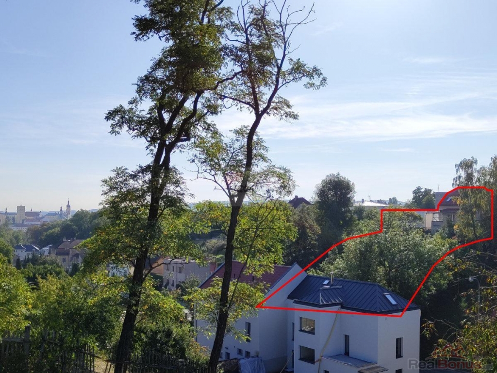 Dům a garáž pro 2 auta jsou umístěny na horní hraně pozemku, kde se svažitý terén vyrovnává. Za domem situovaná klidná a slunečná zahrada díky tomu nabízí jak výhledy do okolí, tak dostatek prostoru pro posezení v soukromí, grilování či bazén. Zahrada má 843 m2.