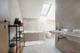 Topení je zajištěné podlahovým vytápěním přes tepelné čerpadlo.