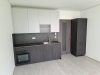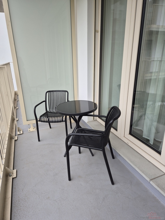 Nová kuchyňská linka se spotřebiči (lednička s výparníkem, varná deska, digestoř, elektrická trouba, prostor na MV troubu, myčka 45 cm, pračka, dřez, baterie), jídelní stůl, 2x židle, TV stolek, křeslo + konferenční stolek, postel. Koupelna (prostorná sprcha, umyvadlo se skříňkou, zrcadlová skříňka, závěsné WC, topný žebřík), hala (skříně, věšáková stěna), světla, venkovní žaluzie, stolek + dvě židle (balkon).