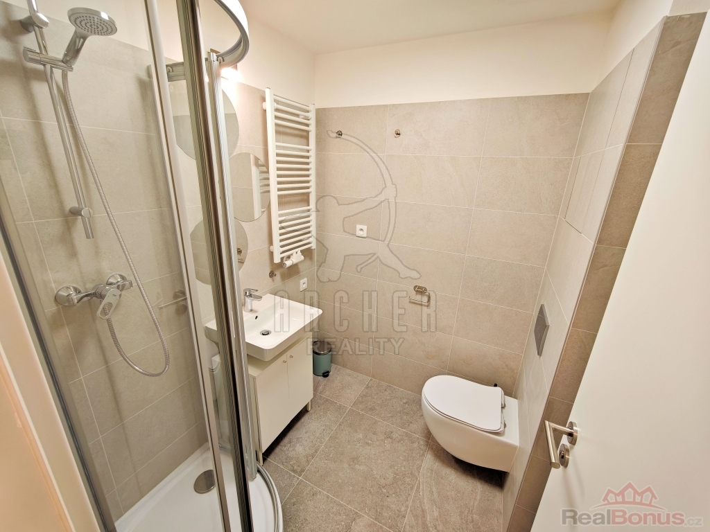 koupelnu se sprchovým koutem, umyvadlem, toaletou, topným žebříkem a přípravou pro pračku.