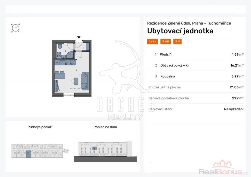 Nabízíme k prodeji moderně řešenou ubytovací jednotku s dispozicí 1+kk, celkem 22 m2, v osobním vlastnictví, Tuchoměřice (okres Praha - západ), ul. V Kněžívce. Projekt Rezidence Zelené údolí v Tuchoměřicích, nedaleko Prahy 6, nabízí moderní apartmány vhodné jak k investici, tak k příjemnému bydlení či pronájmu. Atraktivní lokalita v blízkosti letiště, outletového a zábavního centra, logistických parků a s výbornou dostupností metra (cca 15 minut) či dálnice D7 zajišťuje ideální spojení klidného prostředí a městského komfortu.