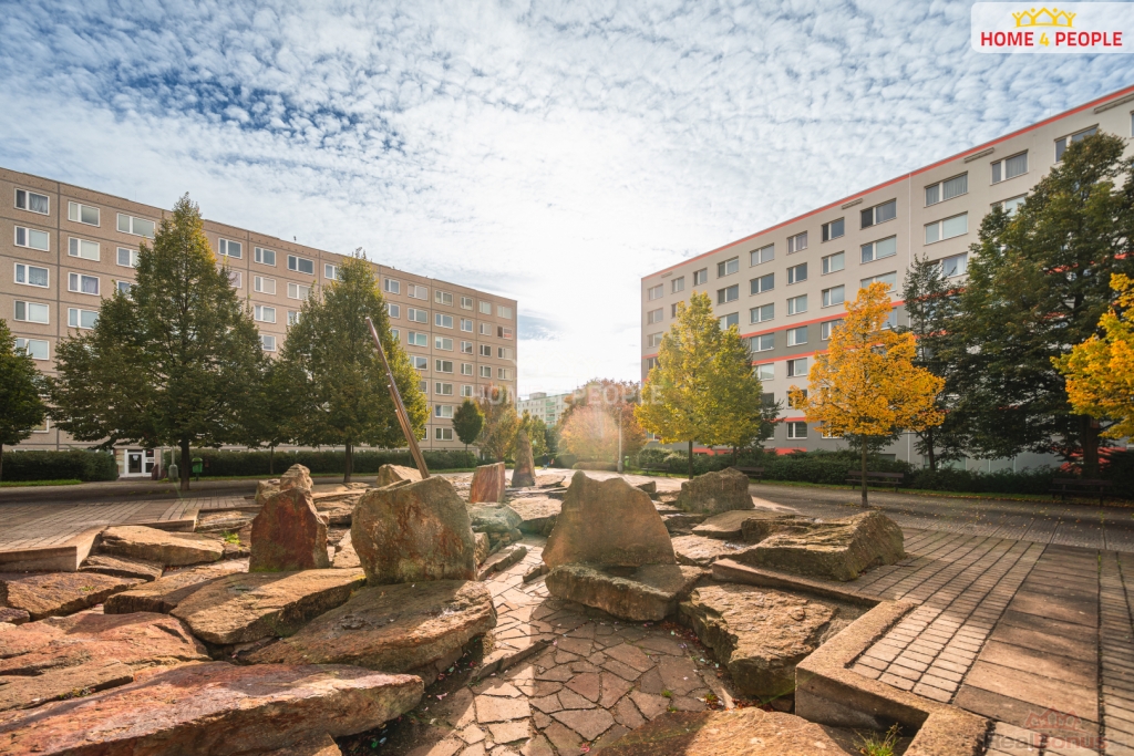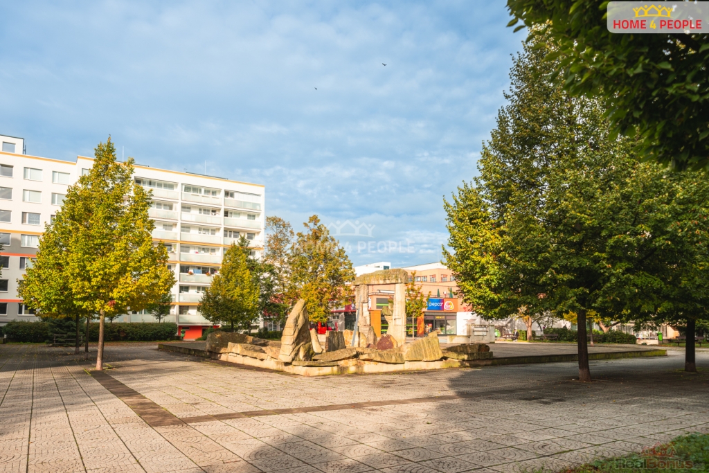 Z jedné strany bytu je příjemný výhled do klidného vnitrobloku, ve kterém se nachází malé náměstí s uměleckou instalací z kamene  několik kamenů rozmístěných vedle sebe vytváří zajímavý a odpočinkový prostor.