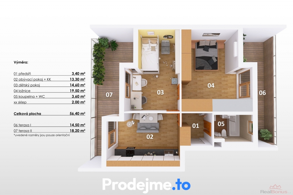 Byt tvoří obývací pokoj s kuchyňskou linkou, ložnice, dětský pokoj a dvě prostorné terasy. Nechybí ani koupelna s vanou a toaletou. Díky vestavěnému nábytku je v bytě dostatek úložných prostor, navíc k němu patří sklep o velikosti 2 m2 a k dispozici je i společná kolárna.