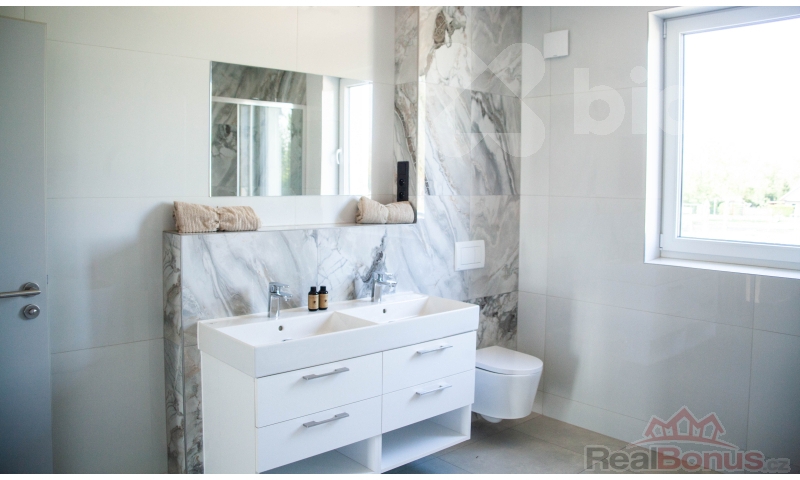 Dům je vybaven kvalitními materiály a prvky, které potěší oko i praktičností - vinylové podlahy, moderní interiérové dveře, plastová okna s izolačním trojsklem, designová sanita značky SAT, baterie SIKO a elegantní obklady Rako Betonico. O vytápění se stará tepelné čerpadlo typu vzduch-voda od značky Willy, což znamená nízké provozní náklady a energetickou efektivitu.