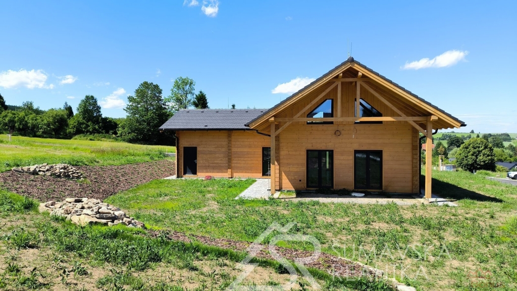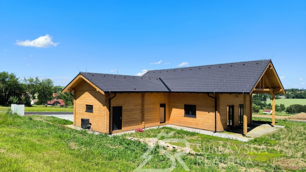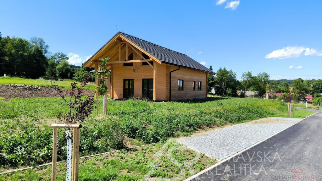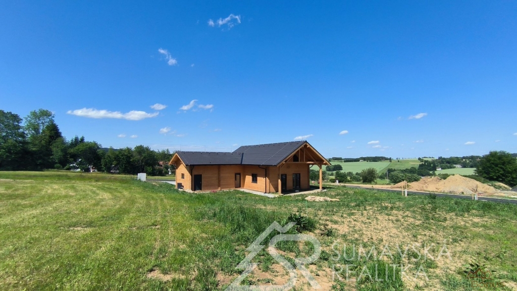 Popis nemovitosti: právě realizovaný rodinný dům je stavěný jako dřevostavba s roubenou obvodovou stěnou z lepených hranolů t.24 cm (bez sedání). Přírodní masivní dřevo je použito i uvnitř domů a vytváří tu správnou atmosféru. Dům je koncipován do tvaru L s vlastní garáží na straně jedné a s velkorysým otevřeným obývacím pokojem s terasou na straně druhé. Uvnitř se nachází dvě ložnice (se šatnou), koupelna, samostatné WC, technická místnost a chodba. Pro užívání je připraveno i podkroví. Střešní krytina je Bramac Tegalit Protector, okna PVC Vekra, sanita od značek Villeroy Boch, Hans Grohe a Riho. Stavba je dokončena s použitím kvalitních standardů (podlahová krytina vinil, vypínače ABB Zoni v černé barvě a bezfalcové dveře). Stejně tak koupelny jsou voleny v materiálech a odstínech k přírodnímu dřevu. Vytápění zajišťuje tepelné čerpadlo Panasonic. Pro případného zájemce se mohou standardy upravit na přání.
