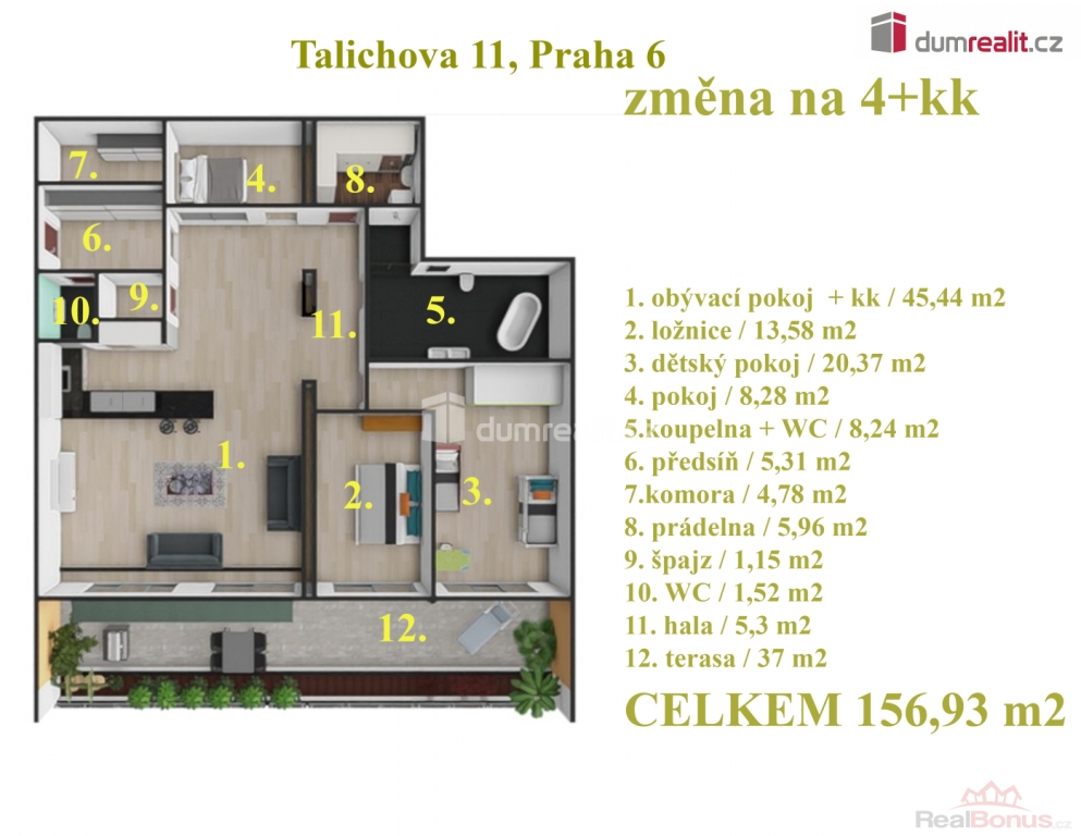 cena je vč. odměny RK, Hledáte byt 3+kk po nákladné rekonstrukci s velkou terasou, ideálně v Praze 6, v Top lokalitě? Mám zde pro vás exkluzivní nabídku kompletně zrekonstruovaného bytu 3+kk (120 m) s terasou (37 m) v Praze 6 Břevnov, ulice Talichova, v docházkové vzdálenosti od parku Břevnovská klášterní zahrada. Tento byt byl v roce 2013 kompletně zrekonstruován a je v TOP stavu kompletní interiéry vč. změny dispozice na 3+kk (lze předělat na 4+kk), podlahy, vstupní dveře, interiérové dveře, plastová okna trojskla, topení konvektory, elektrika, koupelna + WC, kuchyně + spotřebiče a terasa. Dispozici tohoto moderního bytu 3+kk (120 m) tvoří: prostorný obývací pokoj prakticky spojený s kuchyní (45,44 m) a se vstupem na terasu (37 m) s výhledem do zeleně orientace jihovýchod, s jídelním koutem s prostorem pro odpočinek (8,28 m), ložnice (13,58 m) se vstupem na terasu, dětský pokoj (20,37 m) také se vstupem na terasu, předsíň (5,31 m), velká komora (4,78 m), spíž (1,15 m), hala (5,3 m), prádelna s prostorem na pračku/ sušičku a umyvadlem (5,96 m), velká koupelna (8,24) m s volně stojící vanou, sprchovým koutem a umyvadlem. Ve velké kuchyni od společnosti Sykora je vestavěná lednice s mrazákem, varná deska, 2 x digestoř s odtahem mimo byt, myčka, vestavěná trouba, parní trouba a vinotéka. Pracovní deska je z umělého kamene technistone. Byt lze předělat na 4+kk velmi jednoduše viz 3d plánky. Vytápění bytu je centrální dálkové, SVJ nemá úvěr, výtah, střecha, stoupačky, zateplení domu jsou po rekonstrukci. Vstup do bytu v tomto kaskádové domě je bezbariérový, je z ulice Talichova, v 8.patře je výtah, byt je umístěn ve 3. patře domu. Byt je volný ihned, je v osobním vlastnictví, v rámci služeb RK Vám zařídíme exkluzivní hypoteční úvěr. V okolí bytu je absolutní klid, 1 minutu od domu je park (Břevnovský Klášter), zastávka MHD (Bus Talichova nebo Radimova 2 minuty od domu; tramvaj do centra ze zastávky Vojenská nemocnice nebo U Kaštanu), nemocnice ÚVN, školy, školky, obchod Billa je přímo pod domem. Velmi doporučuji všem, kteří hledají nový domov v Praze 6 - Břevnov a požadují byt v TOP stavu. Tento prostorný byt 3+kk (120 m) s terasou (37 m) vás chytne za srdce. Kompletní webová prezentace s více fotkami z bytu je na našich stránkách. Ev. číslo: 652731. Energetický štítek: C (97 kWh/m2/rok).