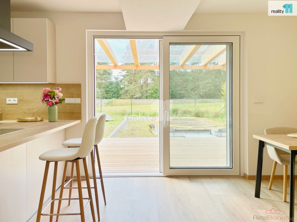 Obývací prostor přímo navazuje na terasu o velikosti 18 m s dřevěnou pergolou, ideální pro společné snídaně i letní grilování. Na zahradě, která nabízí dostatek místa pro dětské hry, stojí také venkovní zastřešený bazén, který zajistí spoustu letních zážitků bez nutnosti opouštět pohodlí domova. Celková plocha pozemku činí 1 000 m, což vám dopřeje dostatek soukromí i prostoru pro malé dobrodružství vašich dětí.
