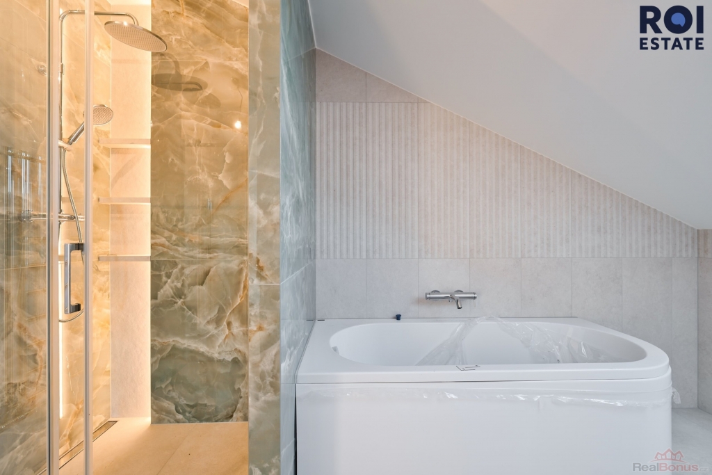 Rodinné domy 5+kk, které zde ve spolupráci s architektem vznikají, nabízí komfortních 167m2 obytné plochy (včetně 26m2 velké garáže). Technickou výhodou domů mimo prakticky řešenou dispozici je tepelné čerpadlo, podlahové vytápění a také propojení s fotovoltaikou. Promyšlené řešení domu podtrhují technické místnosti jako je prádelna s kotelnou, sklad pro zahradu, ale i 3 WC, kdy jedno je přístupné přímo ze zastřešené terasy domu.