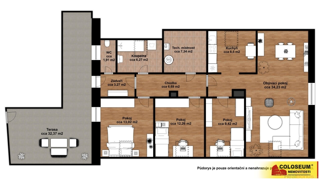 - Obývací pokoj cca 34,2 m2 s jídelním koutem.