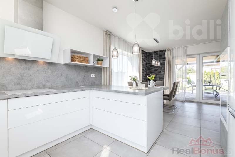 Dominantou domu je prostorný obývací pokoj propojený s kuchyní a jídelní částí. Kuchyňská linka byla vyrobena truhlářem na míru a je vybavena veškerými vestavěnými elektrospotřebiči. Součástí kuchyně je také praktická spižírna. V obývacím pokoji je připraven prostor pro krb (vč. vyvložkovaného komínu).