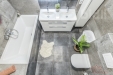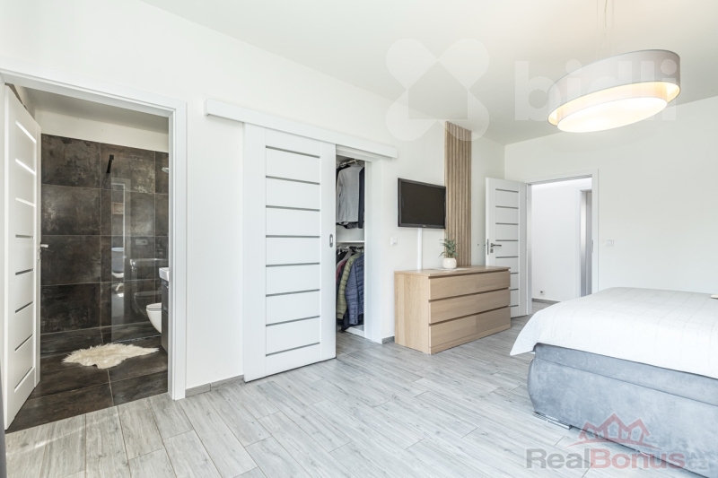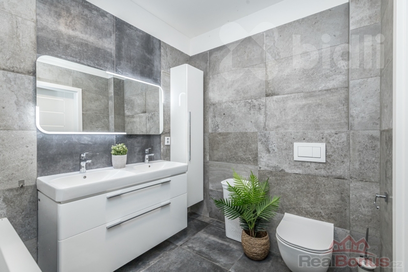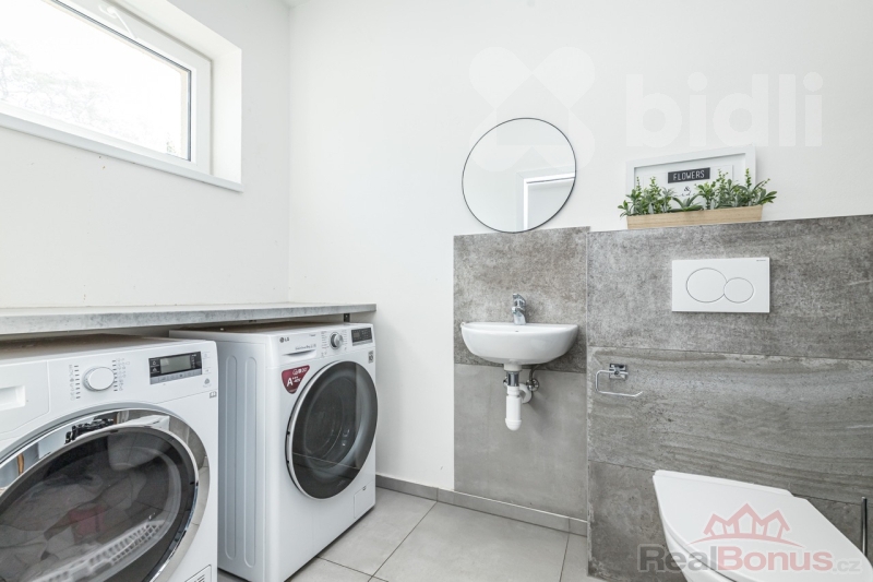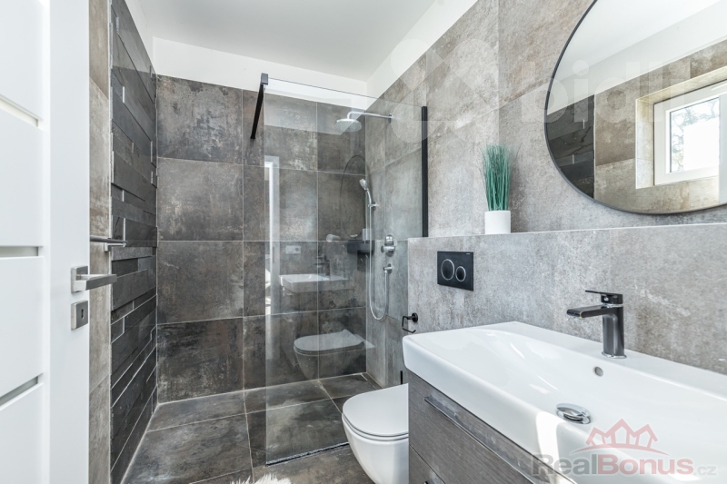 Dům má celkem dvě koupelny s toaletou - hlavní ložnice disponuje jednou z nich, ale navíc i praktickou šatnou. Třetí toaleta je umístěna v technické místnosti. Koupelny jsou vybaveny kvalitními bateriemi značky Hansgrohe. Dvě další samostatné místnosti slouží jako dětské pokoje, pracovna nebo pokoj pro hosty.