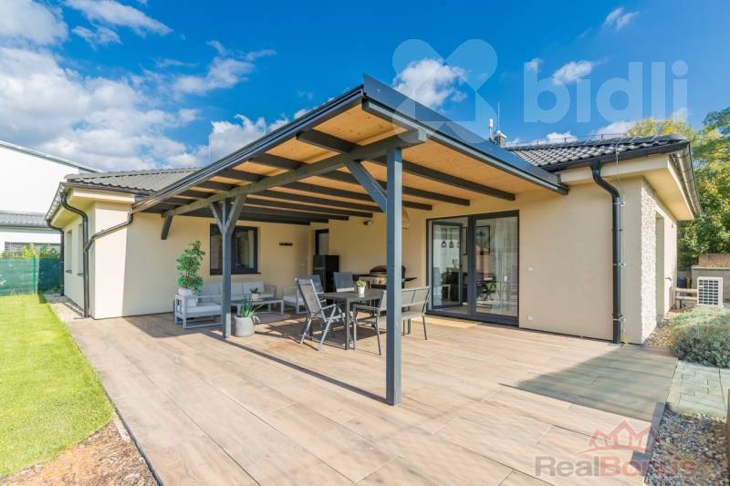 K domu náleží prostorná zastřešená terasa o velikosti téměř 50 m2, ideální pro venkovní posezení, ranní Joģu, nebo bujaré večírky. Zahrada je pečlivě udržovaná, s množstvím vzrostlé zeleně a zapuštěným bazénem. Pro ekologické hospodaření s vodou slouží dvě nádrže na dešťovou vodu, každá o objemu 1000 litrů.