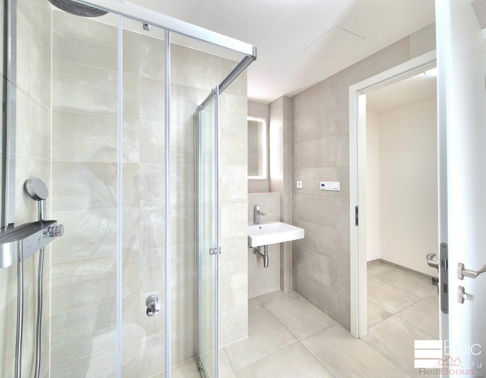 Kuchyňská linka je vybavena vestavěnými spotřebiči, v bytě jsou kvalitní podlahy a koupelna v moderním designu.