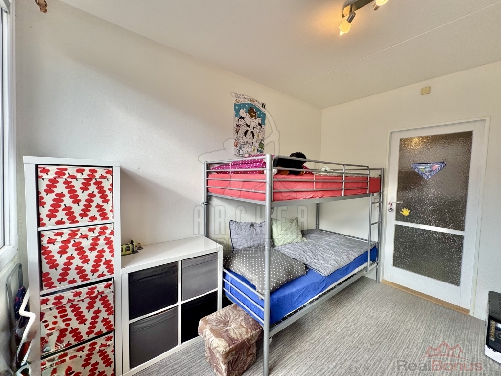 Vedle obývacího pokoje je ložnice vybavená palandou, úložným systémem Ikea a psacím stolem v bílé barvě. Pokoje jsou prosvětlené ze západní strany velkými plastovými okny s dvojskly.