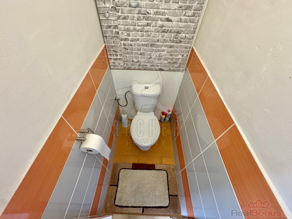 Z předsíně je vchod do koupelny vybavené vanou a umyvadlem s prostorem pro umístění pračky. Vedle koupelny je samostatná toaleta. Vše je ve zděném jádru. Na podlaze v předsíni, v obývacím pokoji a kuchyňském koutě je lino. V ložnici šedý koberec a v koupelně a na toaletě dlažba.