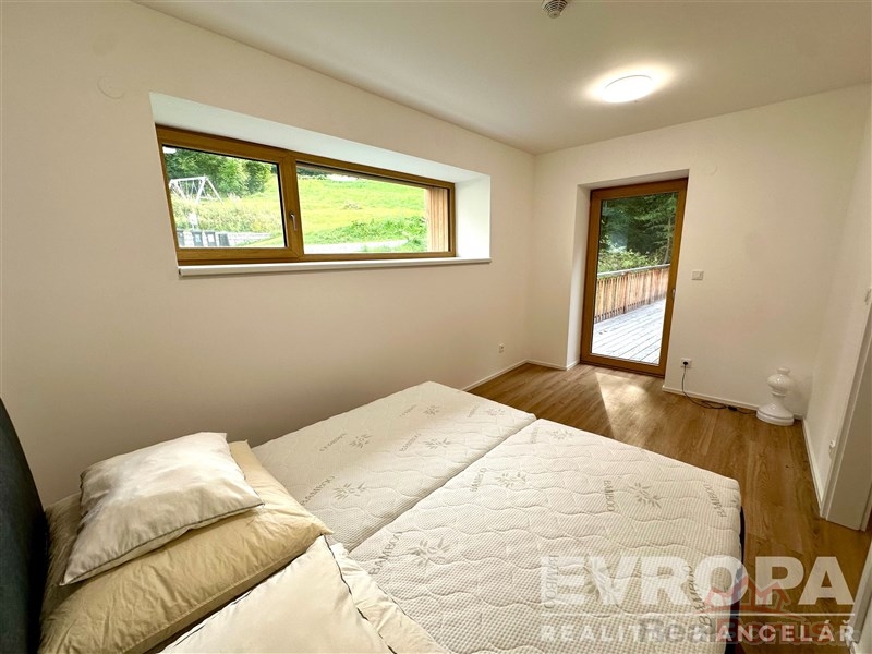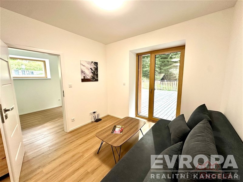 Apartmán nabízí prostorný, světlý obývací pokoj s plynulým přechodem do romantické terasy s výhledem do přírody, jídelní kout, samostatné ložnice, koupelnu, samostatné WC a praktické prostory v chodbách připravené pro vestavěné skříně a technické zázemí bytu. K dispozici je parkovací stání u domu a kóje pro uložení lyží nebo kol.