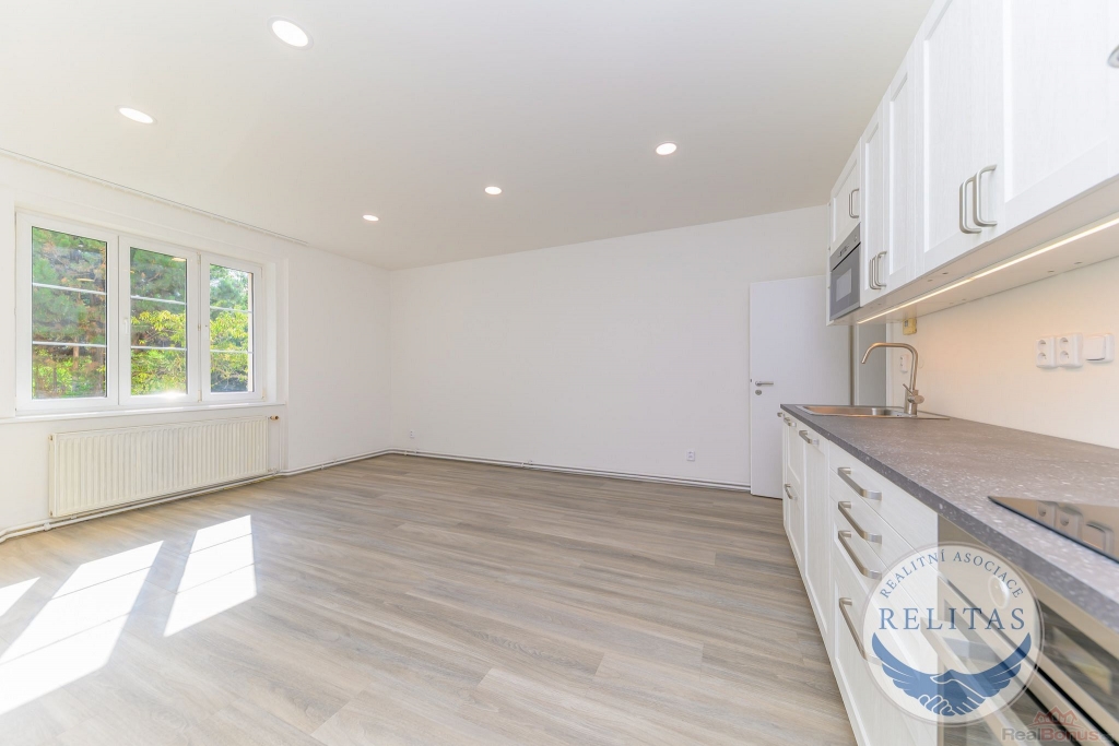 Exkluzivně zprostředkuji pronájem citlivě kompletně zrekonstruovaného bytu 2+kk, 59,6 m v 1. patře cihlové budovy v Peroutkově ulici, Praha 5 - Smíchov, ve vyhledávané části Malvazinky. Byt se sestává z předsíně, obývacího pokoje s kuchyňskou linkou, koupelny se sprchovým koutem, ložnice, samostatně umístěné toalety a komory (vizte, prosím, půdorys). Kuchyňská linka je vybavena elektrickou i mikrovlnnou troubou, varnou deskou, myčkou nádobí a digestoří. V koupelně je k dispozici pračka. Lednice může být dodána. Předsíň a ložnice je vybavena prostornými šatními skříněmi. K bytu přísluší prostorná sklepní kóje a zahrádka v klidném vnitrobloku (52 m), do kterého jsou orientována i okna bytu. Přímo před domem se nachází autobusová zastávka Malvazinky s dostupností na stanici metra =B= Anděl 6 min.