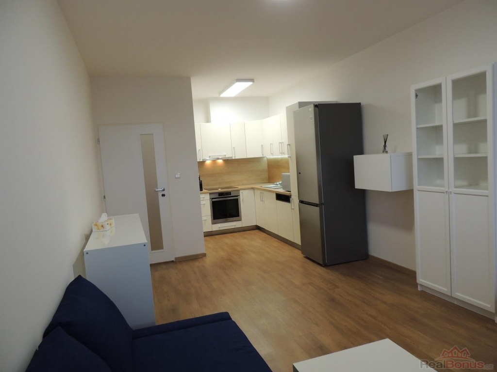 Dispozice: vstupní chodba s vestavnými skříněmi, koupelna s vanou a přípojkou na pračku, samostatné WC, samostatné vstupy do ložnice a obývacího pokoje s kuchyňským koutem s plně vybavenou kuchyňskou linkou: myčka, mikrovlnná trouba, elektrická trouba se sklokeramickou deskou, odsavač par, lednice s mrazákem. Z obývacího pokoje je vstup na balkon s výhledem na jižní stranu do zahrad RD.