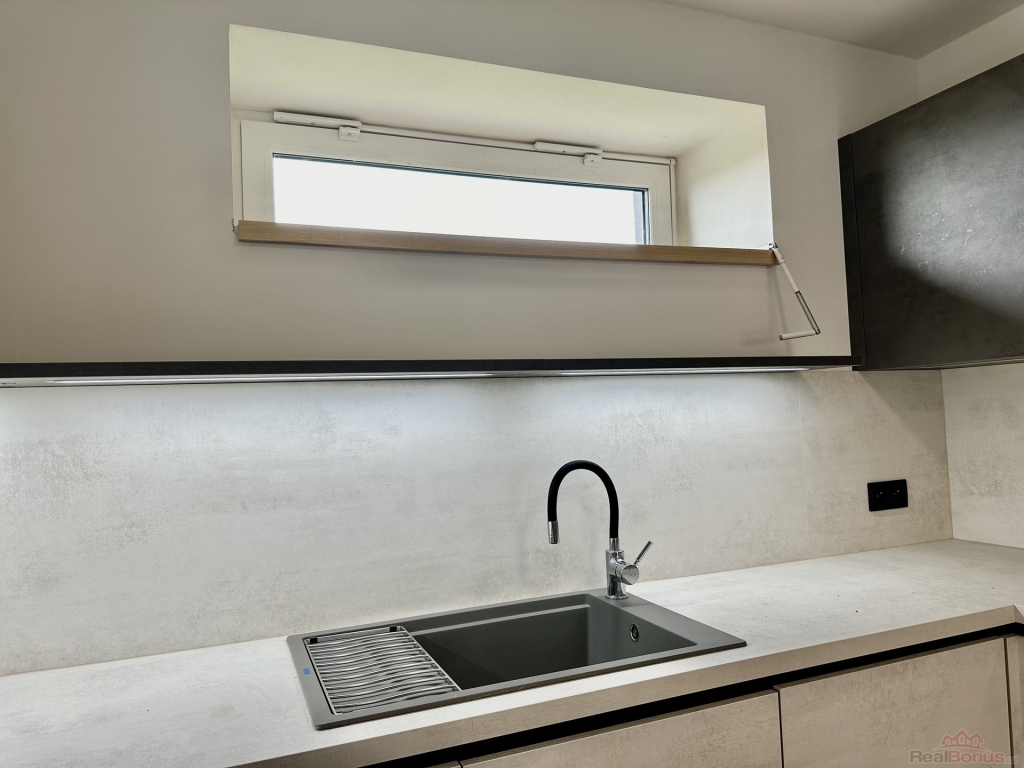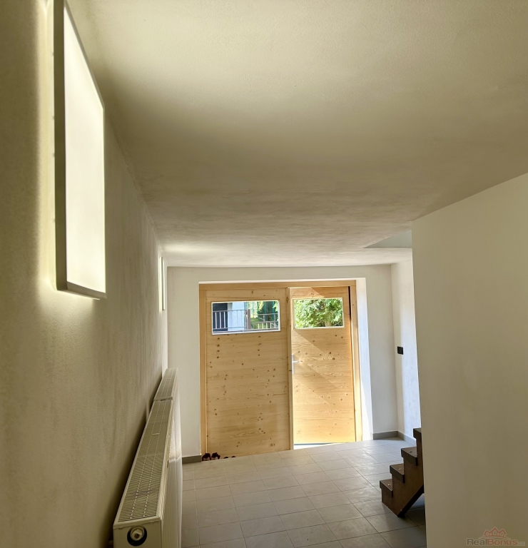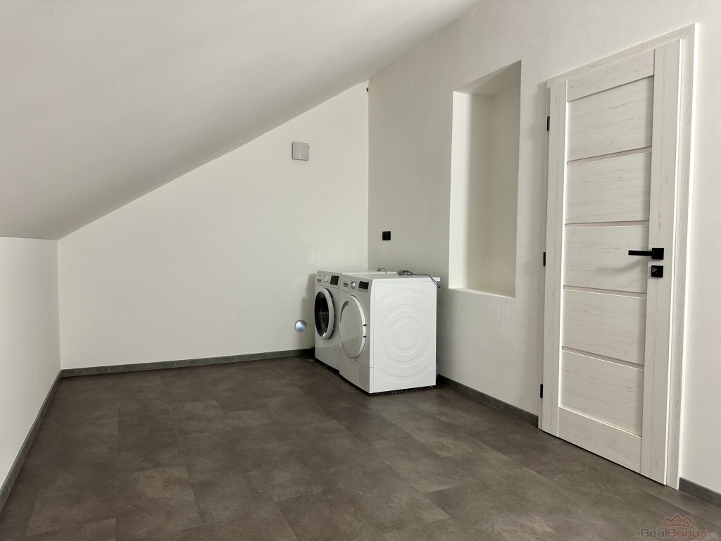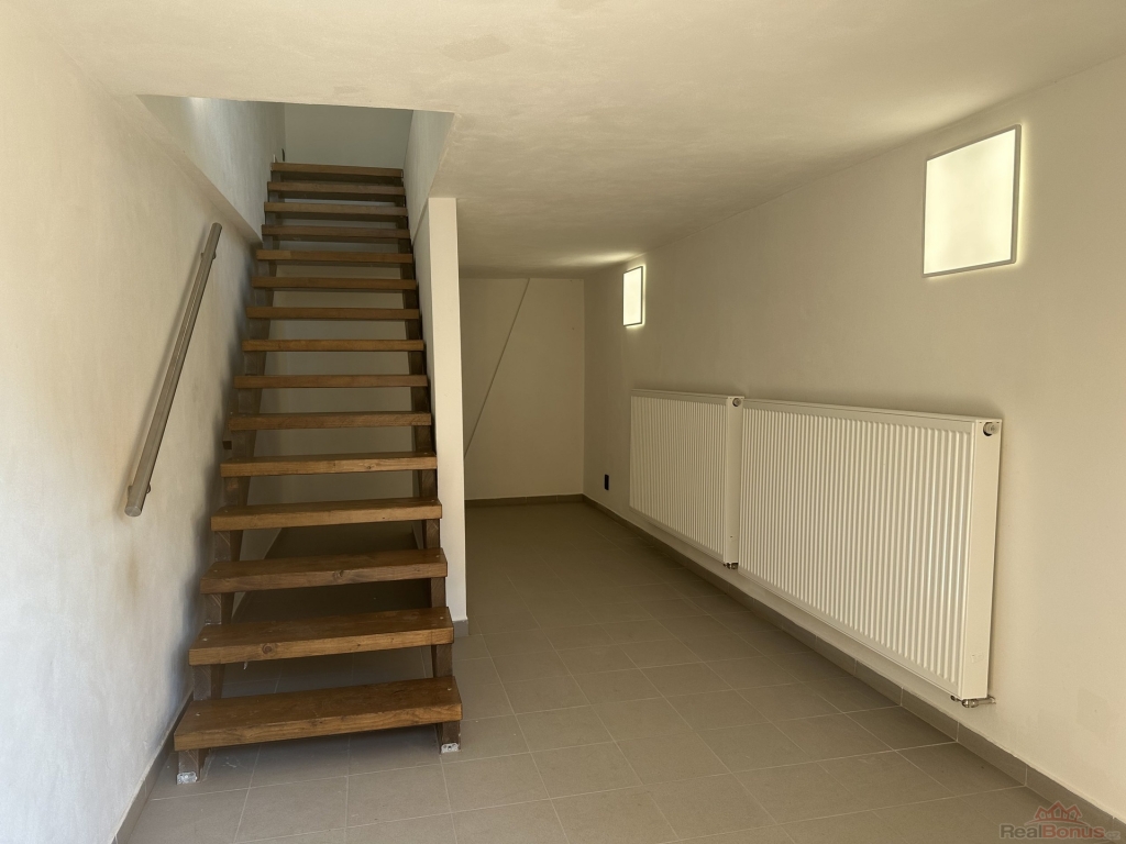 Bytová jednotka má samostatný vstup do domu. V přízemí se nachází vstupní prostor 15m2 s dostatkem úložného místa (např. i kočárku, kola, motorky, apod..), do obytné části v 2.NP vede prostorné schodiště s předsíňovou částí 16m2, která je oddělená dveřmi za kterými se nachází prostorný obývací pokoj s kuch. koutem 71m2, balkon, komora s pračkou Siemens a sušičkou Bosch, ložnice 17m2 koupelna s vanou i sprchovým koutem, samostatné WC. Nová kuchyňská linka je vybavena vestavnými spotřebiči (indukční varná deska, horkovzdušná. el. trouba s grilem, mikrovlná trouba, lednice s mrazákem, digestoř vše Whirlpool)