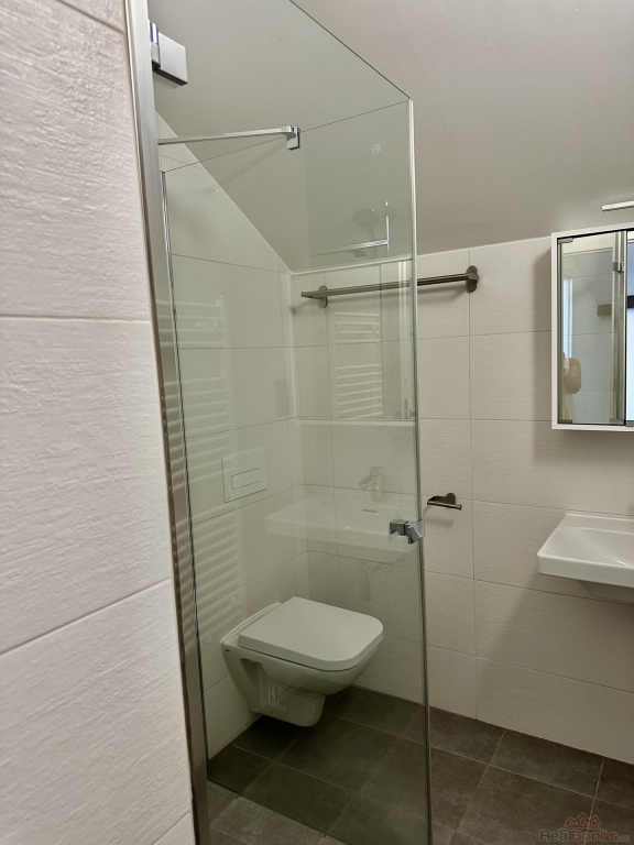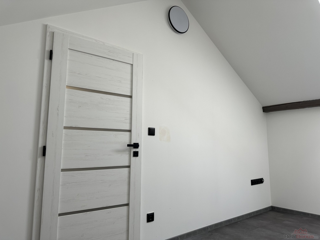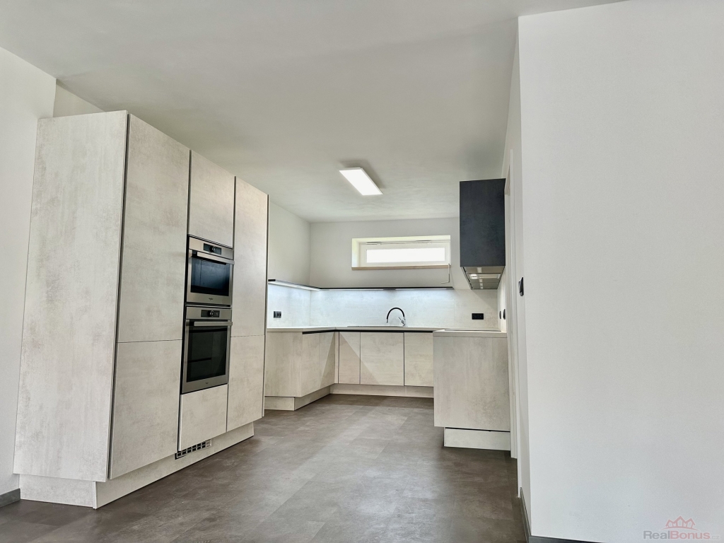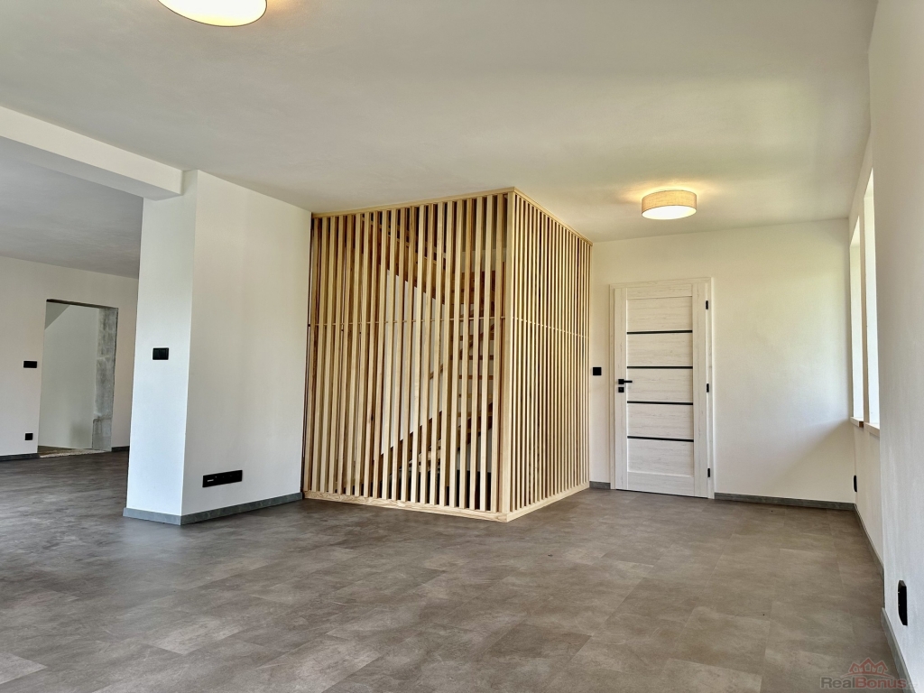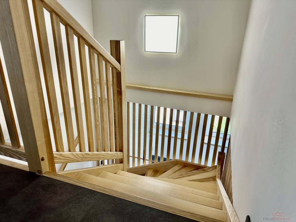 Bytová jednotka má samostatný vstup do domu. V přízemí se nachází vstupní prostor 15m2 s dostatkem úložného místa (např. i kočárku, kola, motorky, apod..), do obytné části v 2.NP vede prostorné schodiště s předsíňovou částí 16m2, která je oddělená dveřmi za kterými se nachází prostorný obývací pokoj s kuch. koutem 71m2, balkon, komora s pračkou Siemens a sušičkou Bosch, ložnice 17m2 koupelna s vanou i sprchovým koutem, samostatné WC. Nová kuchyňská linka je vybavena vestavnými spotřebiči (indukční varná deska, horkovzdušná. el. trouba s grilem, mikrovlná trouba, lednice s mrazákem, digestoř vše Whirlpool)