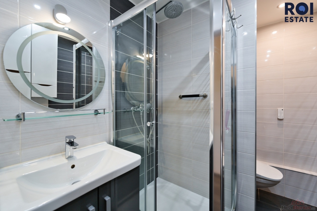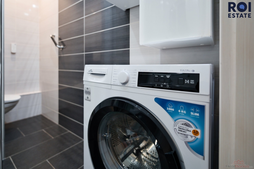 Koupelna je prakticky propojena s toaletou, díky čemuž působí celý prostor vzdušně a prostorně. Dominantou je skleněný sprchový kout, který dodává koupelně nádech luxusu. Nechybí pračka, úložné skříňky, umyvadlová sestava a dokonce WC s bidetovým sedátkem ? pro váš maximální komfort. Celý prostor je laděn do moderních tónů, které působí čistě a harmonicky.