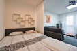 Díky chytré posuvné zástěně se prostor umí proměnit podle vaší nálady ? přes den útulný obývák, večer klidná ložnice.