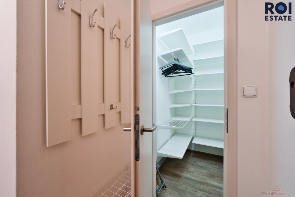 V předsíni vás přivítá prostorný šatník s regály, který nabízí dostatek místa na oblečení, kufry i sezonní věci. Po pravé straně čeká praktický botník s věšákem, takže vše má své místo hned při vstupu.