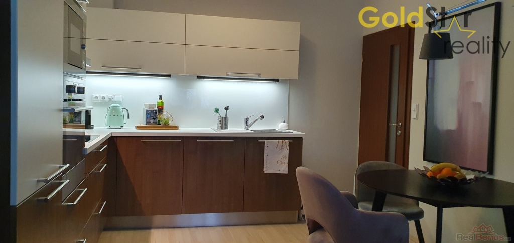 Součástí prodeje je kompletní vybavení na míru ? kuchyňská linka se všemi vestavěnými spotřebiči (včetně myčky a velké lednice s mrazákem), televizní stolek, vestavěná šatní skříň, kompletní vybavení chodby a komory a další zakázkový nábytek od společnosti Hanák. V bytě jsou kvalitní plovoucí podlahy a stylové osvětlení. Byt je napojen na ústřední topení, internet i satelit.  Byt je ve skvělém stavu a  je ihned k nastěhování.