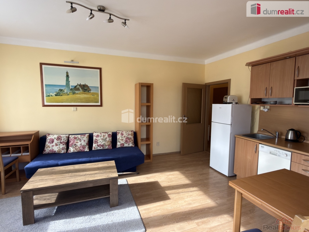 Dominantou je světlý obývací pokoj s kuchyňským koutem, jídelním stolem, pracovní zónou a pohodlnou rozkládací sedačkou vhodnou i pro každodenní spaní.