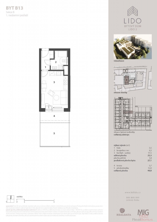 vstupní chodba (3,5 m2), obývací pokoj s kuchyňským koutem (17,5 m2), koupelna s WC (4,3 m2), terasa (5,7 m2), předzahrádka (12,0 m2)