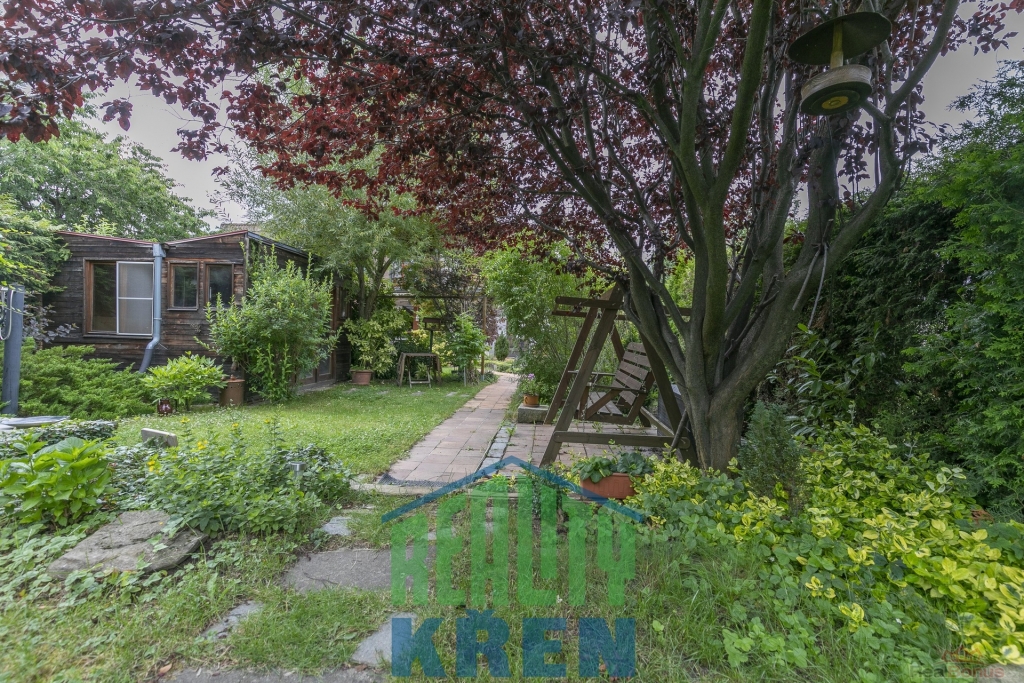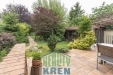 Kolem domu udržovaná zahrada se vzrostlými okrasnými stromy a se dvěma zahradními altány.