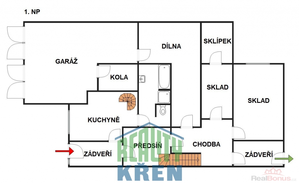 1. NP: garáž 42 m2, dílna 24 m2 , sklepní prostory 31 m2, vstup na zahradu,