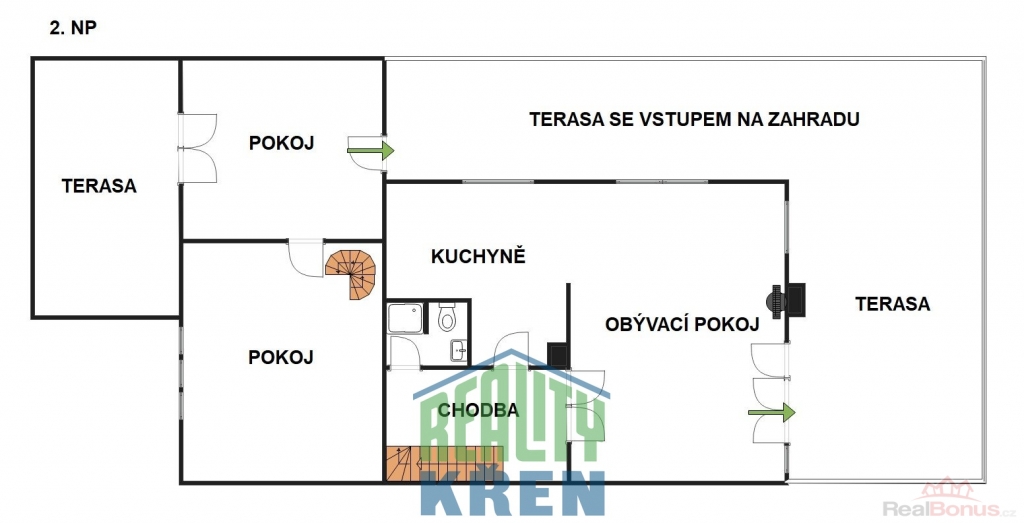 1. NP + 2. NP: mezonetová bytová jednotka 2+1 69 m2 - kuchyně s jídelnou, koupelna s vanou, sprchovým koutem a WC, schodiště, 2 samostatné pokoje se vstupy na terasy a dále na zahradu.