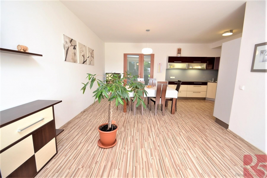 Velký kuchyňský kout s vestavěnými spotřebiči navazuje na jídelnu a obytnou část prosvětlenou velkými francouzskými okny kterými projdete na terasu s výhledem do zeleně.