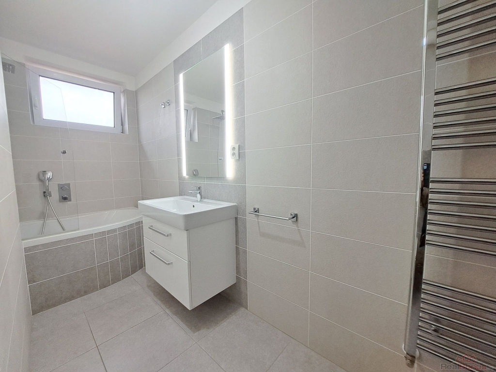 Koupelna s oknem (vana se zástěnou vč. sprchové hlavice, umyvadlo se skříňkou, připojení na pračku, zrcadlo, topný žebřík, závěsné WC, vlastní plynový kotel, větrák).