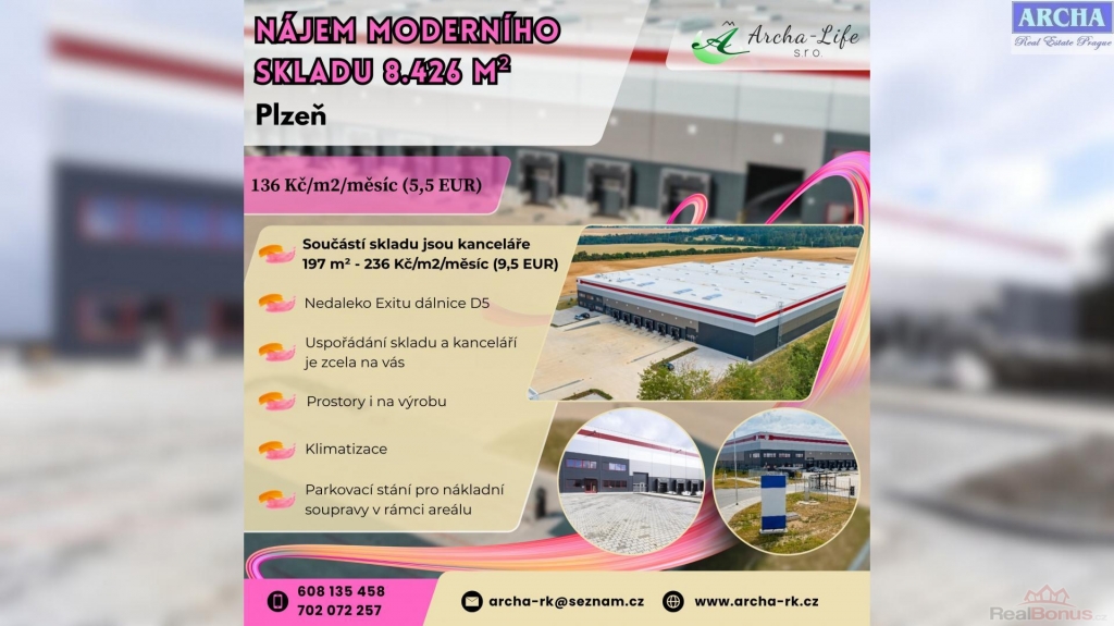 Cena nájmu skladu: 136 Kč/m2/měsíc (5,5 EUR)