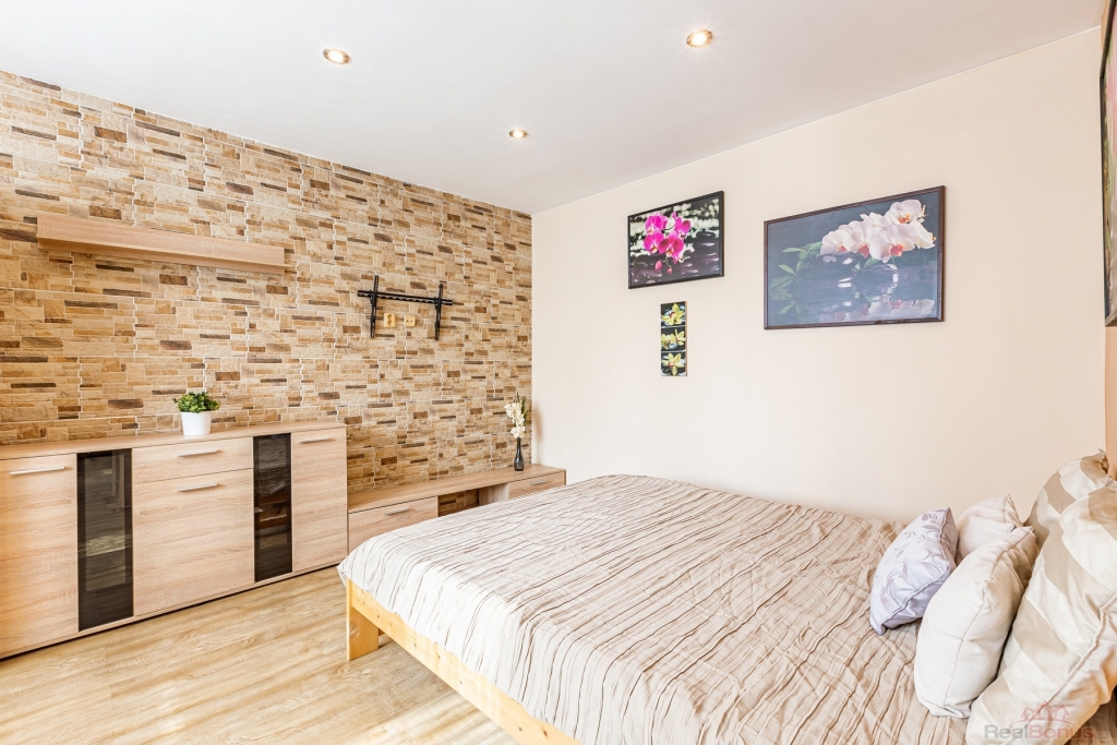 Bytová jednotka je v dobrém stavu, vybavena dle fotografií. Byt sestává z ložnice, kuchyně, předsíně a koupelny. Kuchyňská linka s kombinovaným plynovým sporákem, dvojdřez, mikrovlnná trouba, samostatně stojící lednice. Kuchyně je vybavena jídelní sestavou. V ložnici se nachází dvojlůžko s nočními stolky, šatní skříně, komody. Předsíň se skříněmi a botníkem. Koupelna je vybavena vanou, součástí je pračka.