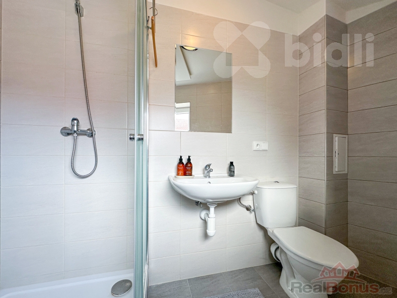 Byt se skládá z pokoje a z koupelny, kde je sprchový kout, umyvadlo, WC a topný žebřík.