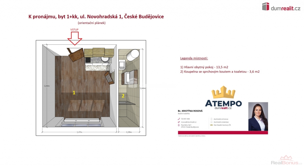 + poplatky 1.500,-Kč. Více informací Vám poskytne makléřka Bc. Kristýna Rosová , Dumrealit.cz Vám zprostředkuje podnájem udržované bytové jednotky 1+kk v širším centru města České Budějovice, ul. Novohradská 1. Byt se nachází v nejvyšším podlaží zatepleného panelového domu s výtahem. Byt je v pěkném udržovaném stavu připravený ihned k nastěhování. Nájemné činí 7.000,- Kč + poplatky 1.500,-Kč/měsíc. Měření energií je podružnými měřidly. Hledáme solidního nájemce. Více informací Vám poskytne realitní makléřka Bc. Kristýna Rosová z realitní kanceláře A TEMPO fungující pod ochrannou známkou dumrealit.cz. Ev. číslo: 652850. Energetický štítek: G